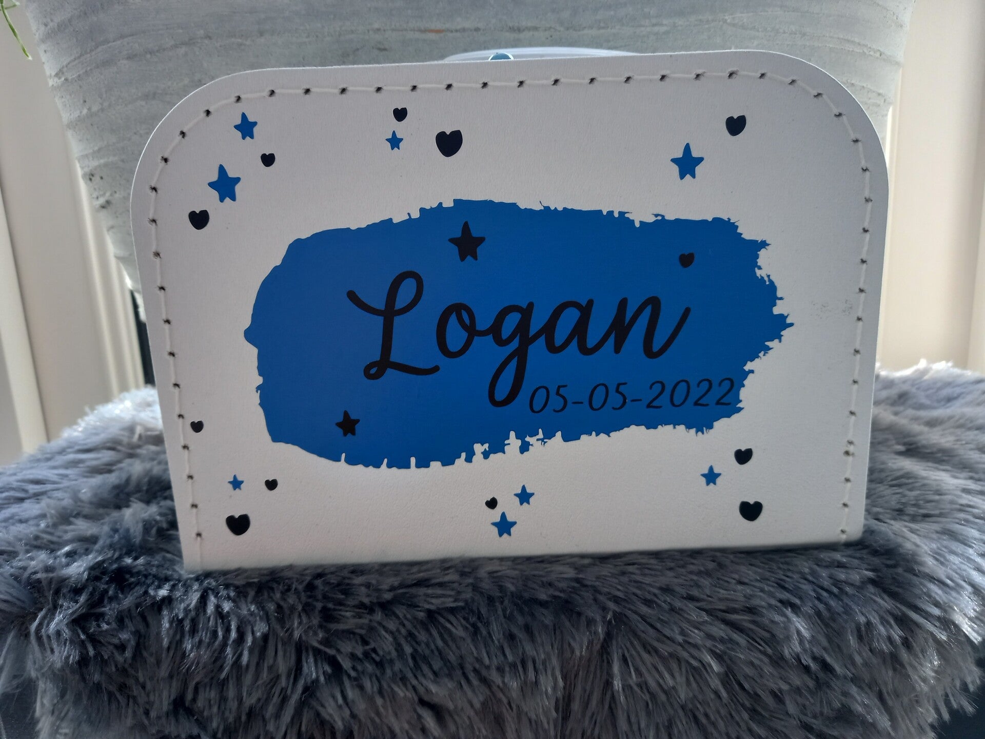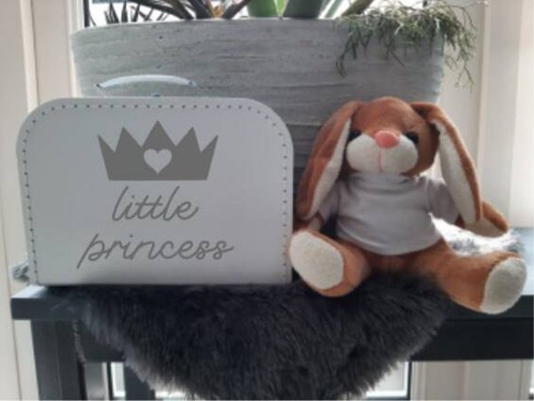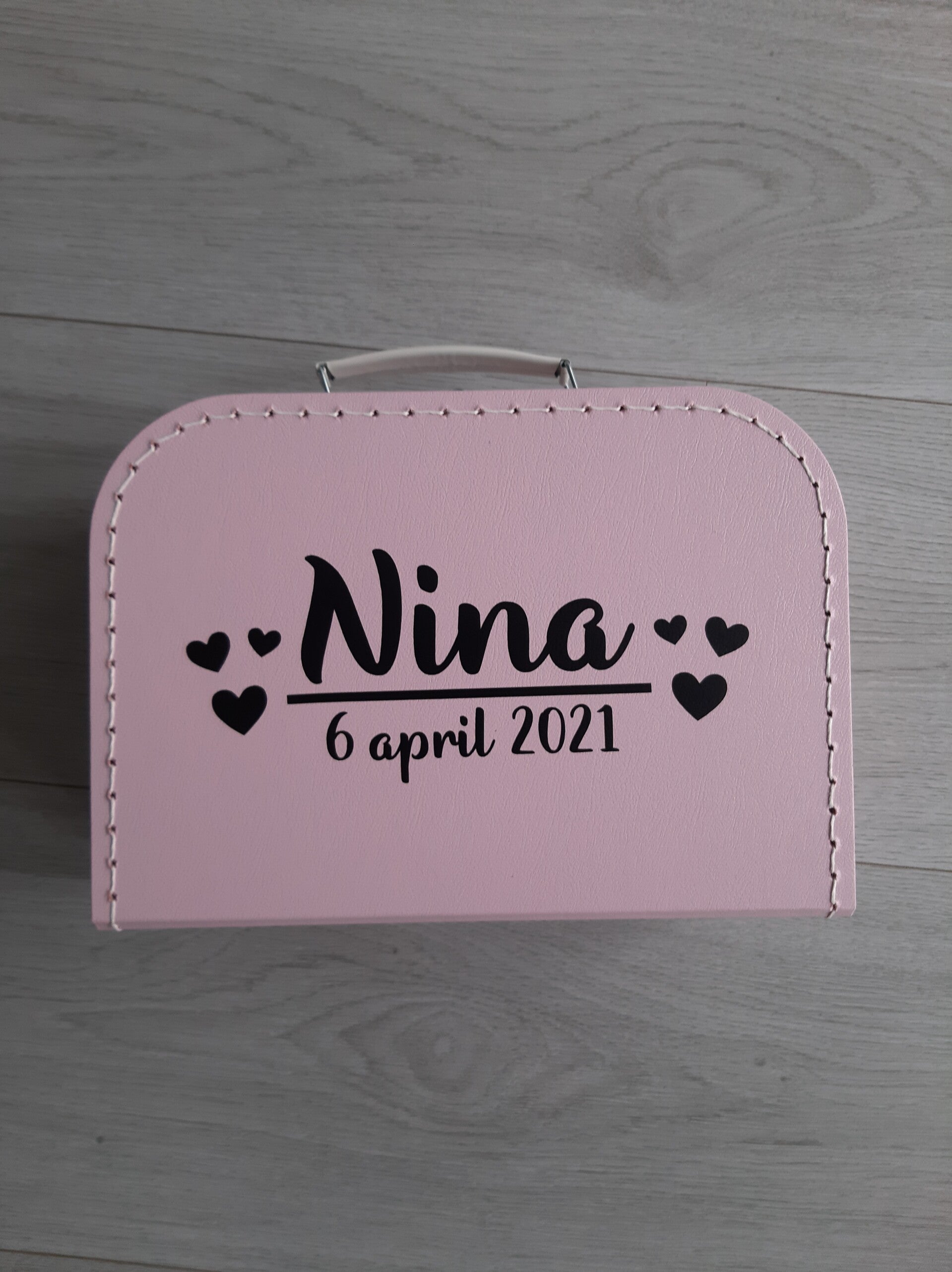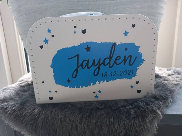Handig om spullen in op te bergen of herinneringen in te bewaren. Maak je koffer persoonlijk door een naam, geboortedatum of leuke tekst.